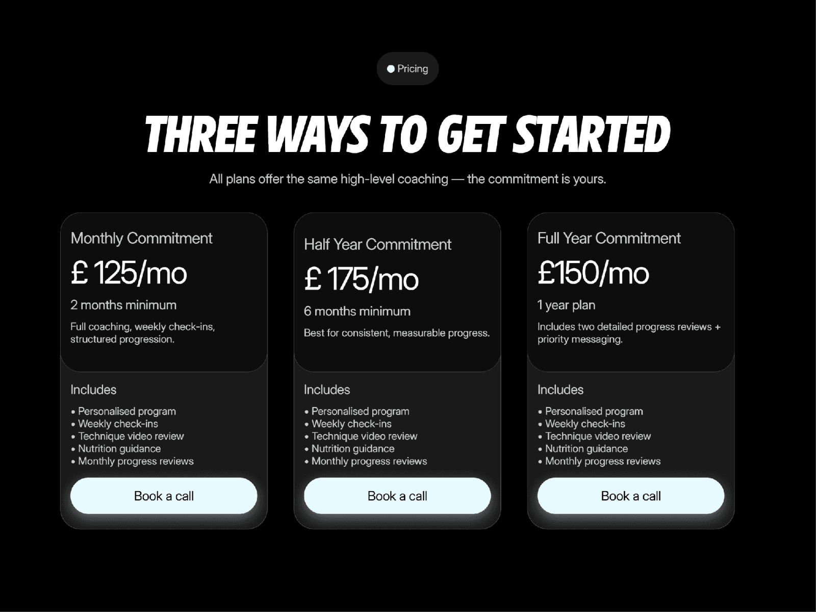 The page communicates the offer using a clear coaching flow: Assessment → Program Design → Feedback & Adjustment → Long-Term Progression, plus structured pricing packages to help visitors choose quickly.