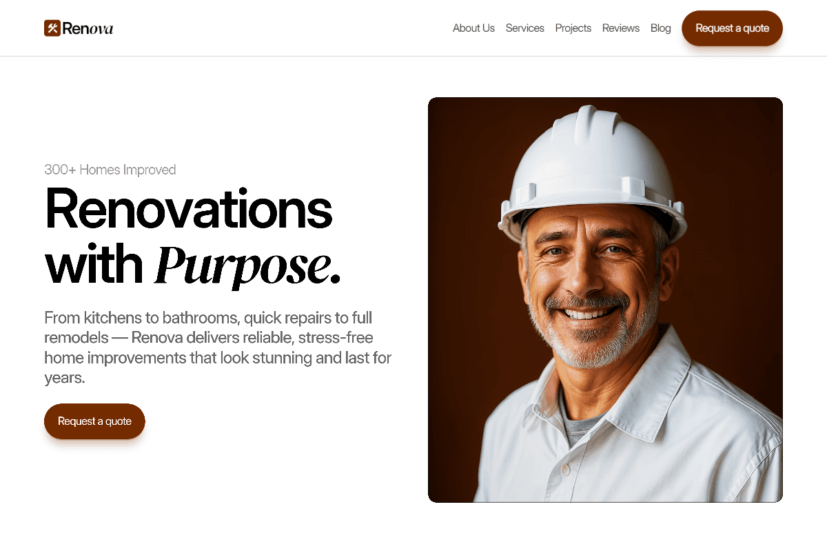 Renova is a home improvement / renovation website built to sell “stress-free” remodels. It positions the brand around renovations with purpose, covering everything from kitchens and bathrooms to quick repairs and full remodels, with a clear “Request a quote” CTA and trust-first messaging.