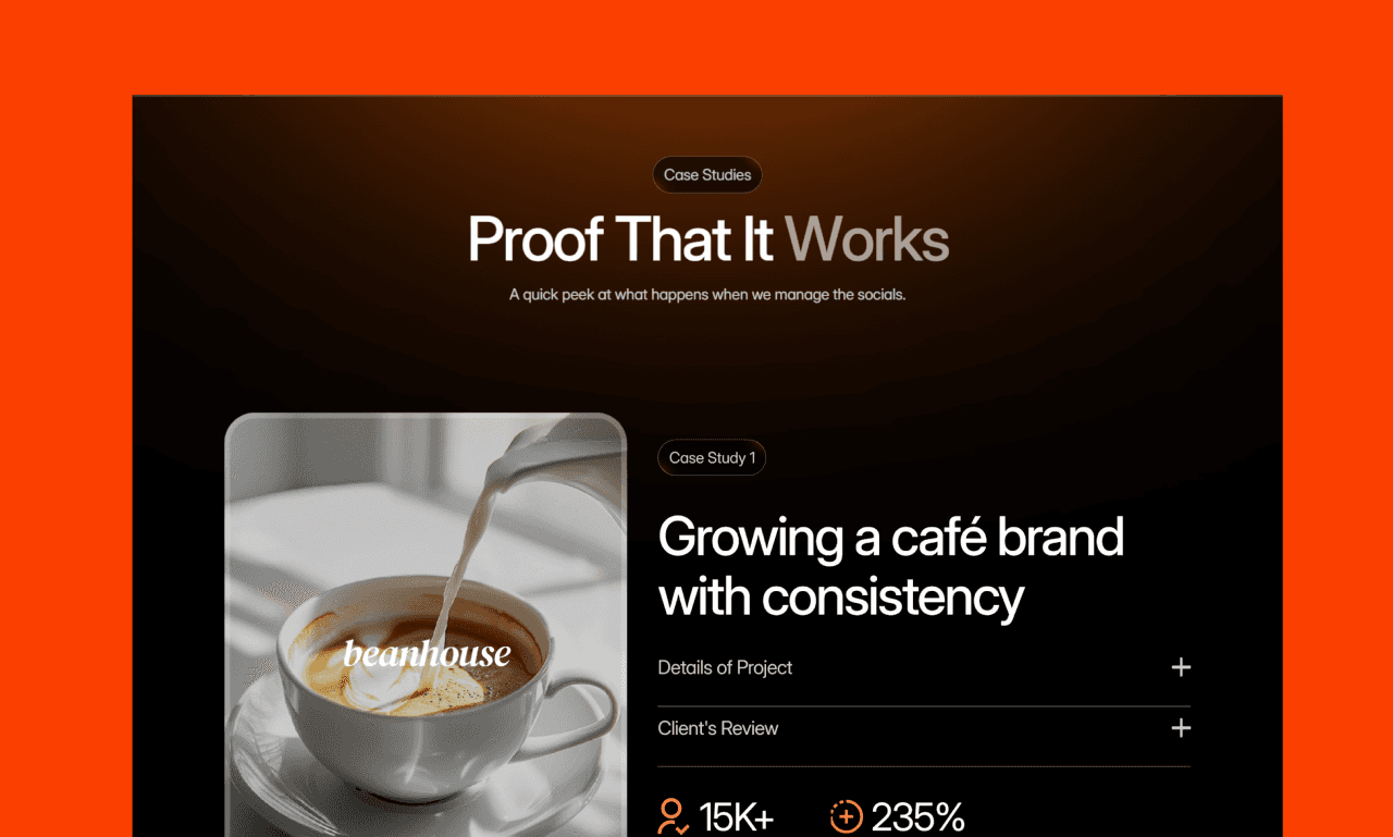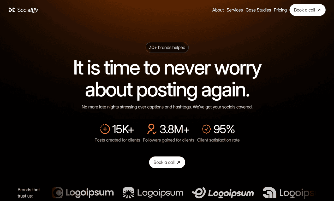 Socialify is a marketing agency website that targets businesses tired of social media management. The hero promise is simple: “never worry about posting again”, backed by a full done-for-you approach from planning to posting.